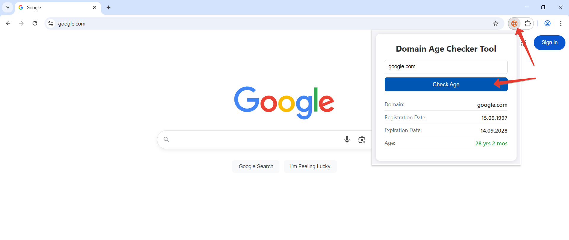 Step 2 of 3. Open the website you want to check, then simply click on the extension icon. The domain will be automatically loaded into the tool.
